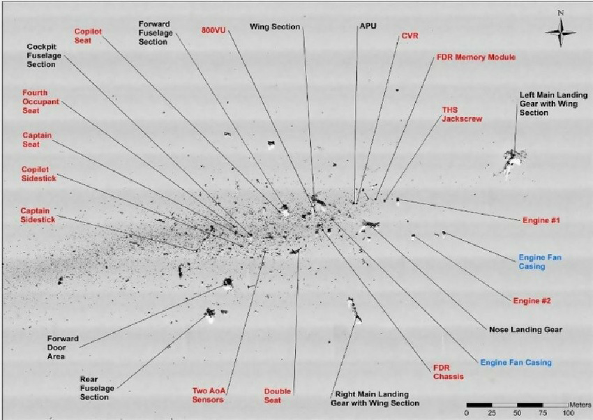 So investigators went back to take a closer look and this is what they saw in a higher resolution image. They could clearly make out distinct, identifiable fragments of the plane, especially large parts like the landing gear and engine cores.