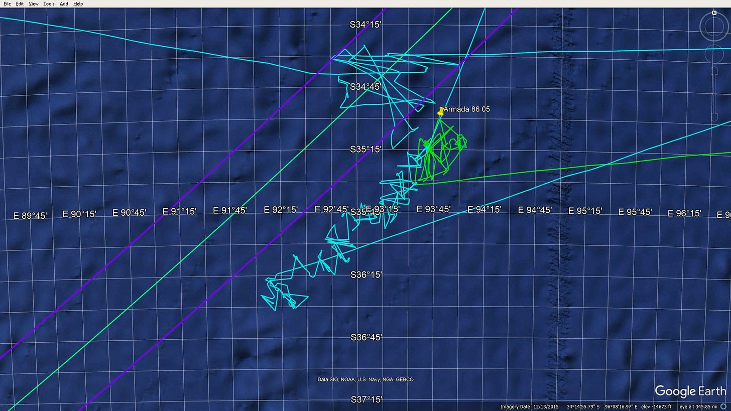 So obviously the work was proceeding at a suboptimal speed because one of the AUVs could not be deployed, and the bad weather in the area forced them to take a hiatus. Based on Marine Tracking data provided by Kevin Rupp, Armada 86 05 spent a couple of days cooling its jets, hanging out in a small area and waiting for the bad weather to pass.