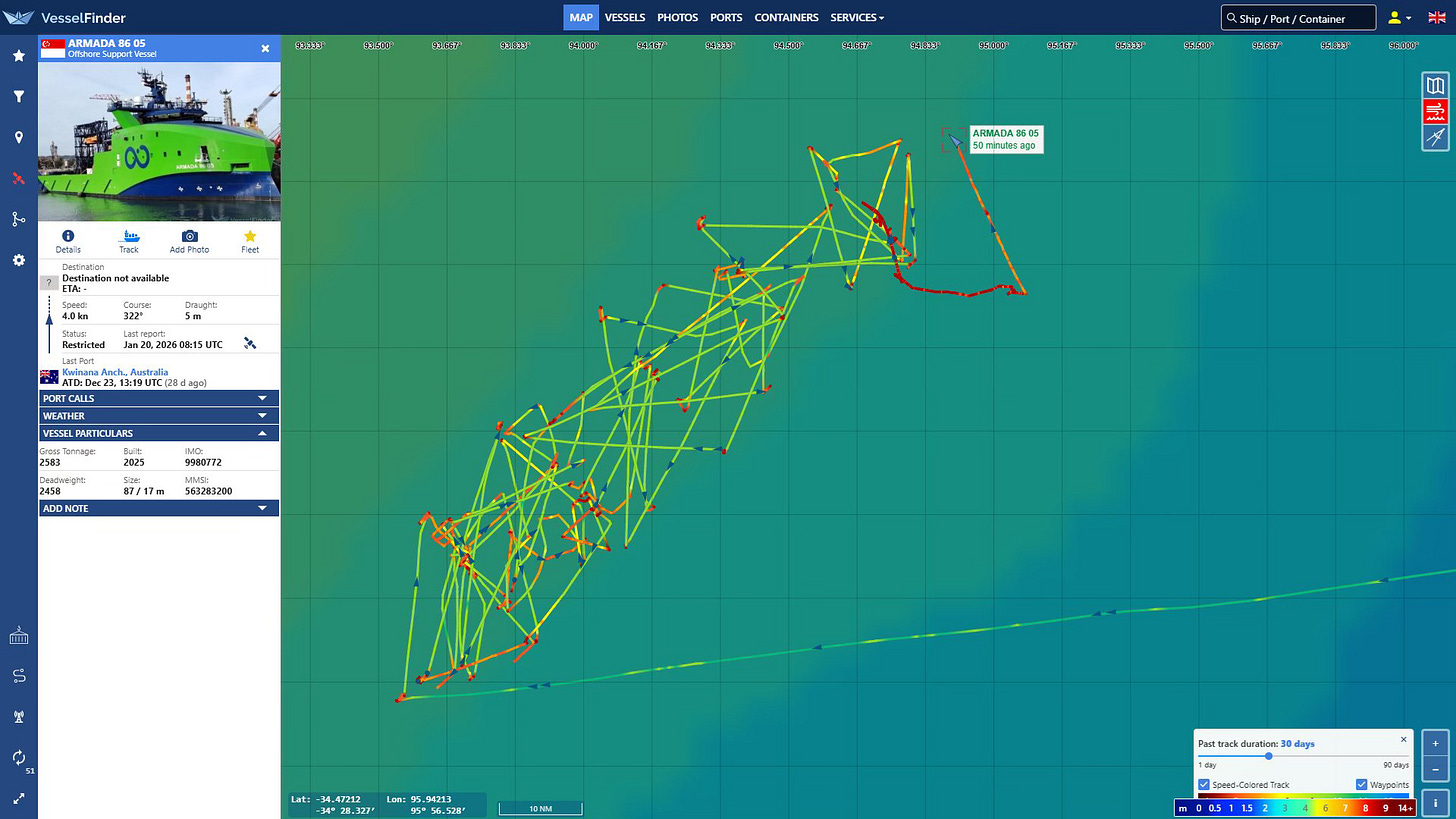 Kevin says that the weather is not looking good for the continuation of the seabed scan between now and then. He wrote on Twitter earlier today, “After a brief respite, conditions are about to get pretty rough for Armada 86 05 again…I still don’t know why they didn’t run for Fremantle.”