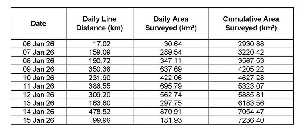 Between 06 and 15 January 2026, search operations onboard Armada 8605 were conducted in the designated search area on the southern side of the 7th arc, primarily utilising up to 3 x Hugin Autonomous Underwater Vehicles (AUVs). Operations resumed on 06 January following prior activities and proceeded steadily through the reporting period, subject to technical and environmental conditions.