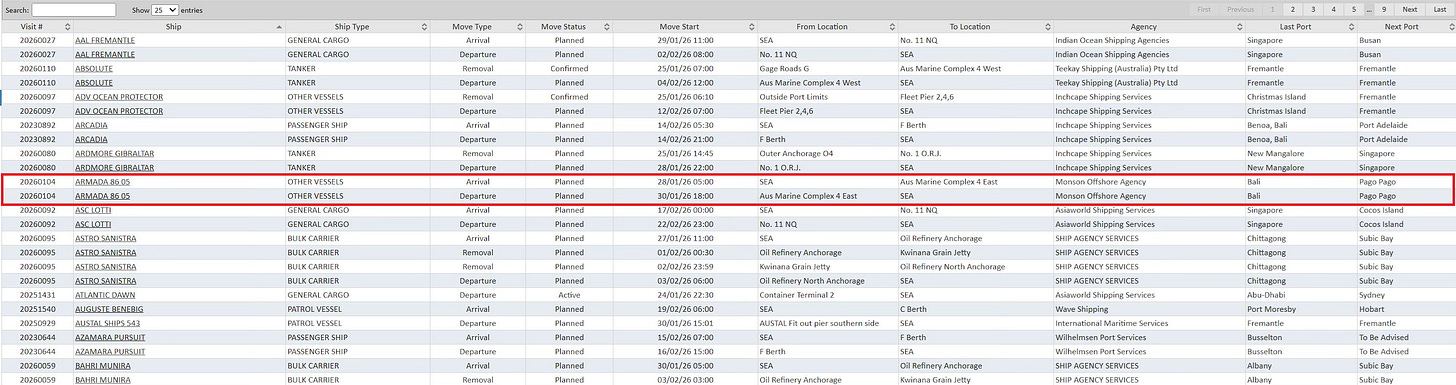 The Fremantle port schedule shows that at the moment the field for “Next Port” is Pago Pago, in American Samoa. That sounds like bad news.